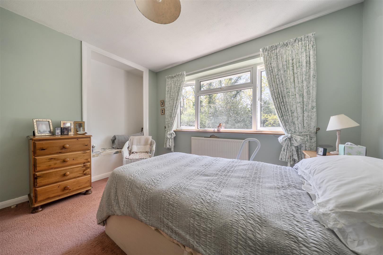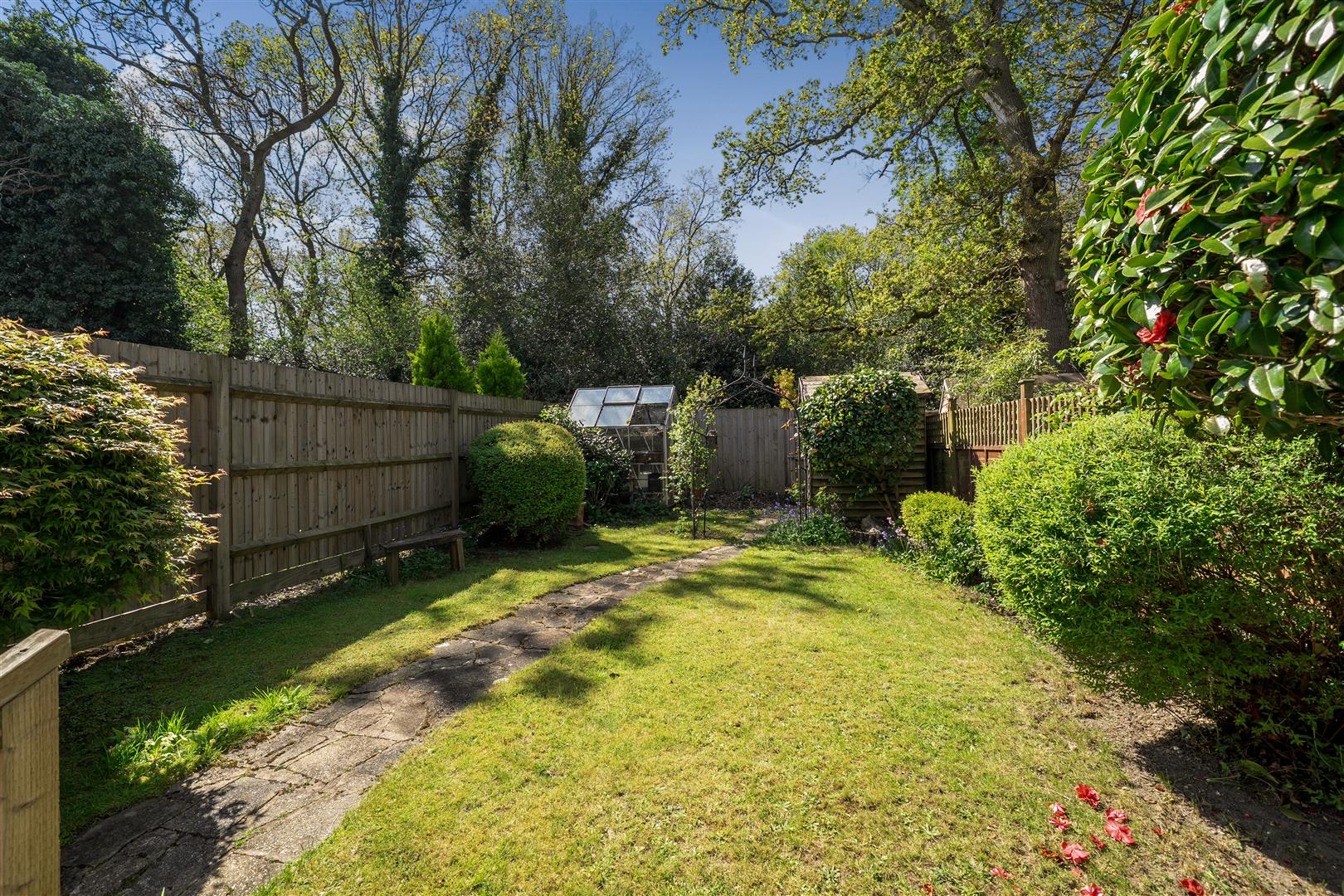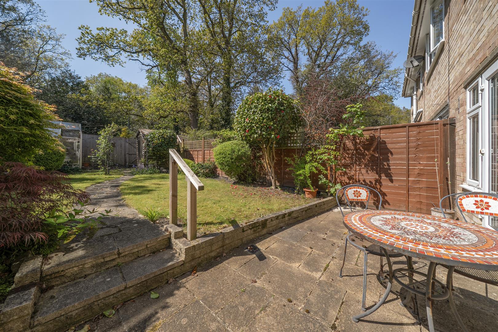 Externally, the front of the property provides a driveway with off-street parking, leading to an integral garage. To the rear, the garden features a patio area extending to a lawn, complemented by mature trees and shrubs. There is also a timber-built shed and greenhouse, with the entire garden enclosed by panel fencing and backing onto woodland, offering a good degree of privacy.