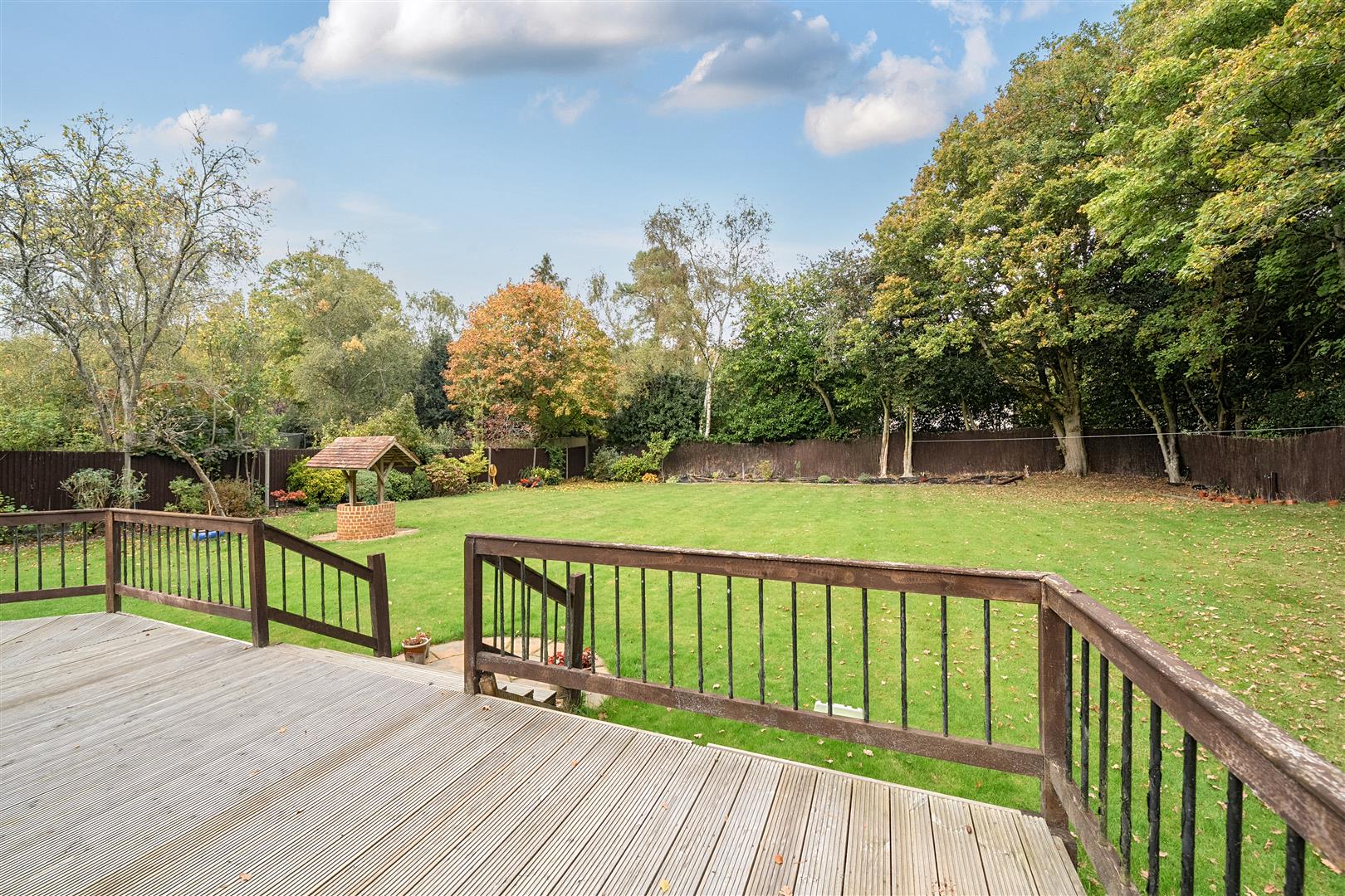 Externally, a sweeping gravel driveway provides ample parking and leads to a double-width garage. The rear garden is a particular highlight—beautifully landscaped with a raised decking area, a large covered seating space, and a substantial lawn bordered by mature trees and hedging, offering excellent privacy.