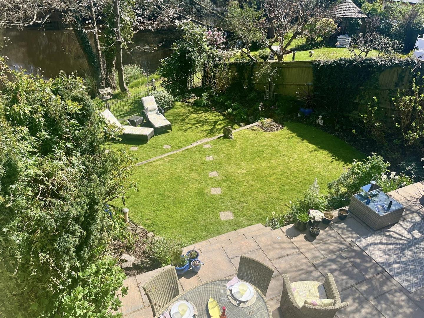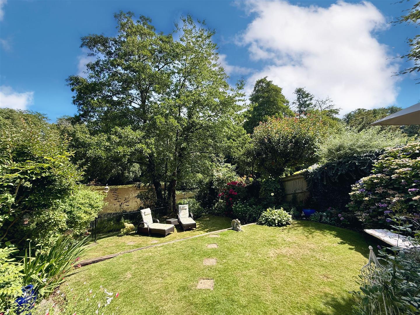 The private garden is a true sun trap, boasting a spacious terrace that’s perfect for alfresco dining, summer barbecues, or simply relaxing with a glass of wine as the sun sets. A carefully curated mix of flowerbeds, mature trees, and manicured lawns creates a vibrant yet serene outdoor haven.