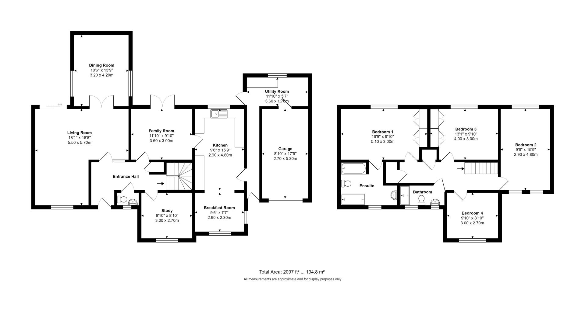 The property is accessed via a covered entrance porch which opens into a welcoming entrance hall with stairs to the first floor and doors to the principal reception rooms. The main living space is an impressive 21ft L-shaped living room, bathed in natural light and featuring double doors opening into a 13ft dining room, perfect for entertaining. From the entrance hall, you’ll also find a front-aspect study, ideal for those working from home, and a 11ft family room with sliding patio doors leading out to the rear garden. The 15ft kitchen is well-appointed with generous work surfaces, ample storage units, an Aga, and some integrated appliances. An archway opens into a bright 9ft breakfast room, providing a cosy spot for informal dining. From here, access leads to an inner hallway with doors to the front of the home and the 11ft utility room, which in turn connects to both the rear garden and the 17ft garage. A cloakroom completes the ground floor accommodation.