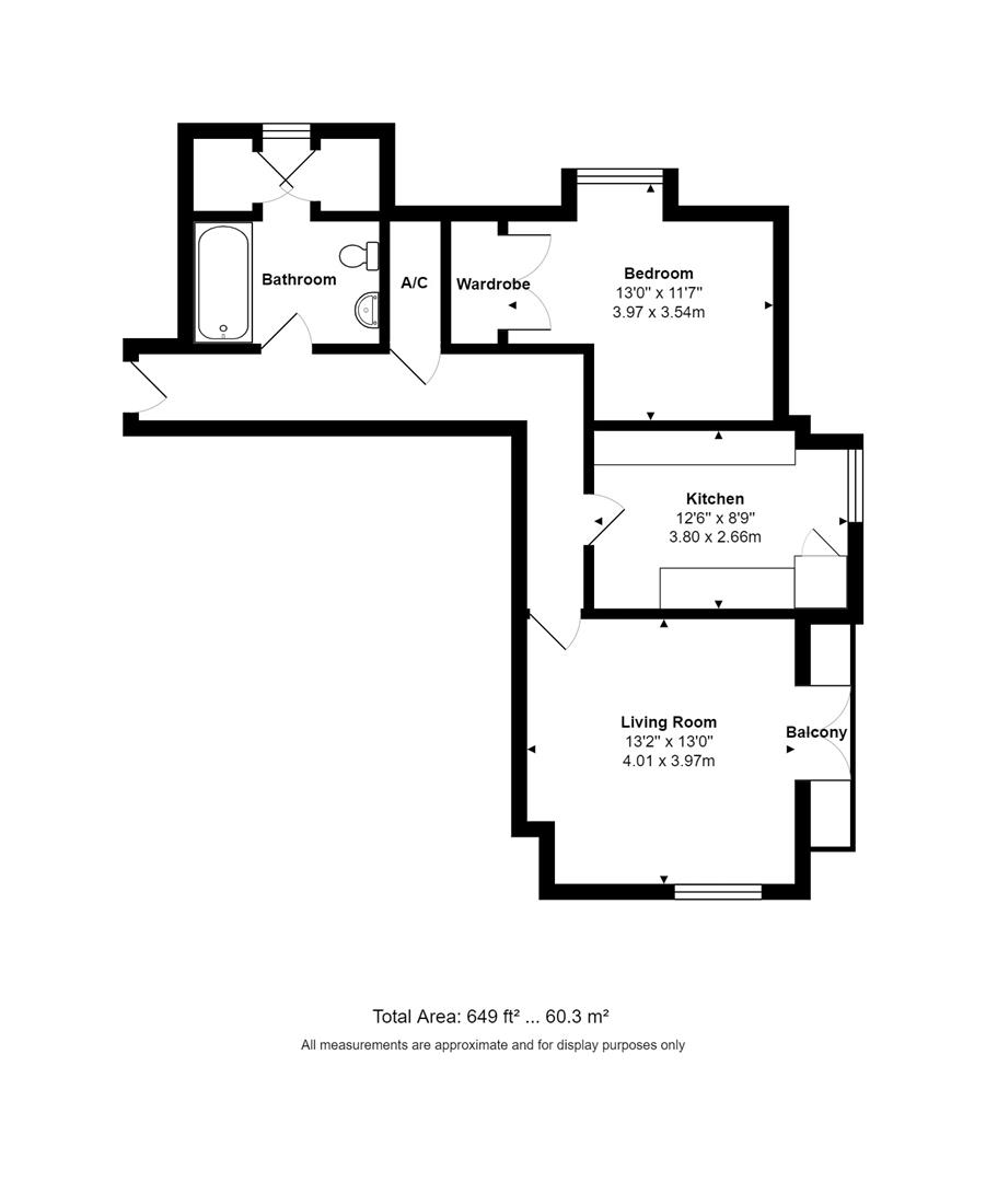 As you step inside, you’re greeted by a welcoming hallway that flows seamlessly into the bright and airy living room. Large windows flood the space with natural light, and French doors lead out to a private balcony—perfect for enjoying your morning coffee or unwinding in the evening. Adjacent to the living room, the kitchen offers generous counter space and storage, with plenty of room for cooking. The bedroom is equally impressive in size, featuring a dedicated wardrobe area for excellent storage solutions. The bathroom is well-appointed with a full-sized bathtub, complemented by a separate A/C closet for added convenience.