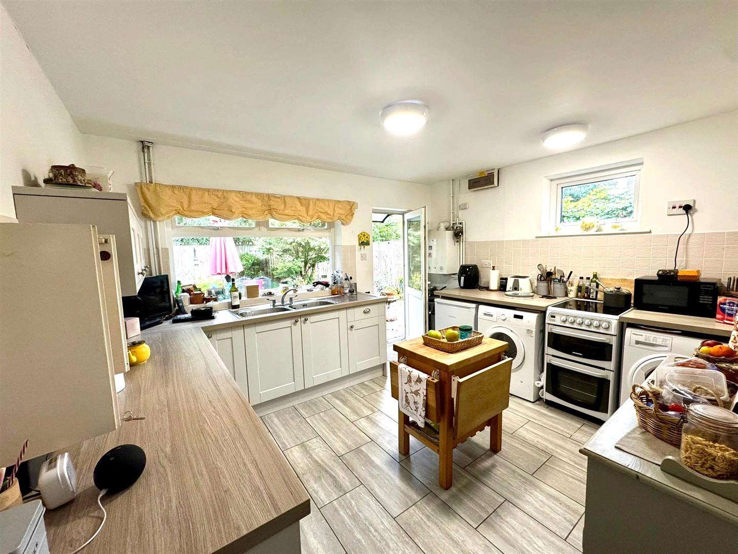 The kitchen has been thoughtfully updated and features a range of eye and base level units with roll-top work surfaces, inset sink with mixer tap, space for appliances, and room for a breakfast table. Dual aspect windows ensure plenty of natural light, and a door provides direct access to the rear garden.