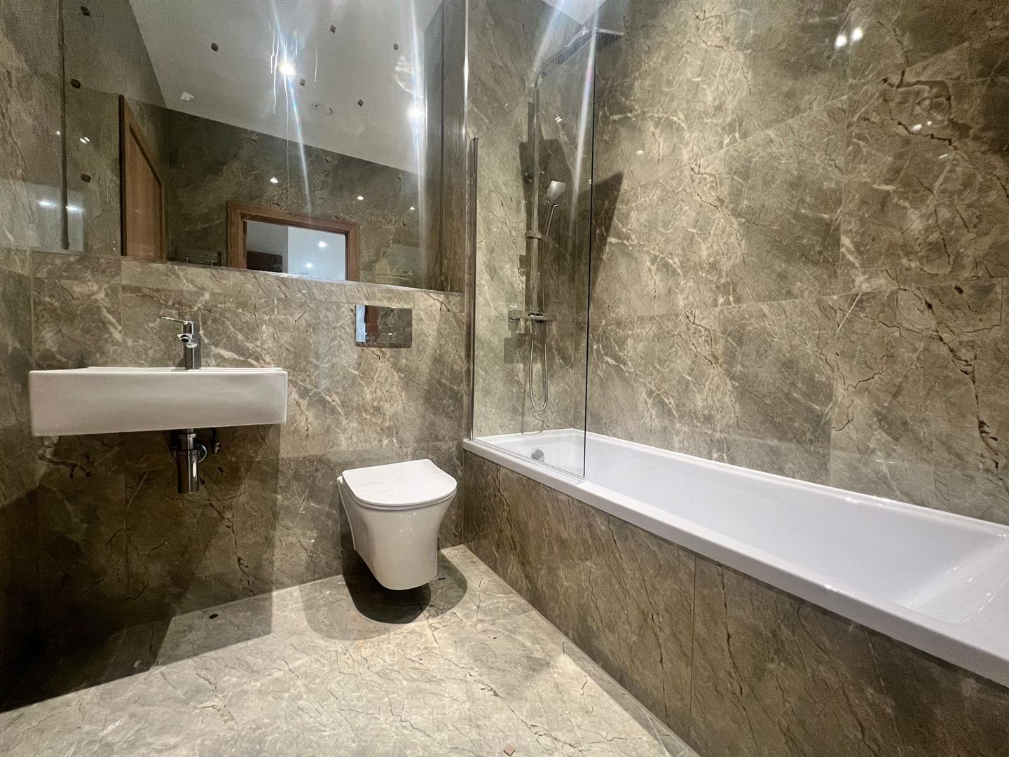 The bathrooms are finished to a high standard, fully tiled in a marble-effect design, complemented by chrome accents, a modern hand basin, WC, and a cocktail rail.