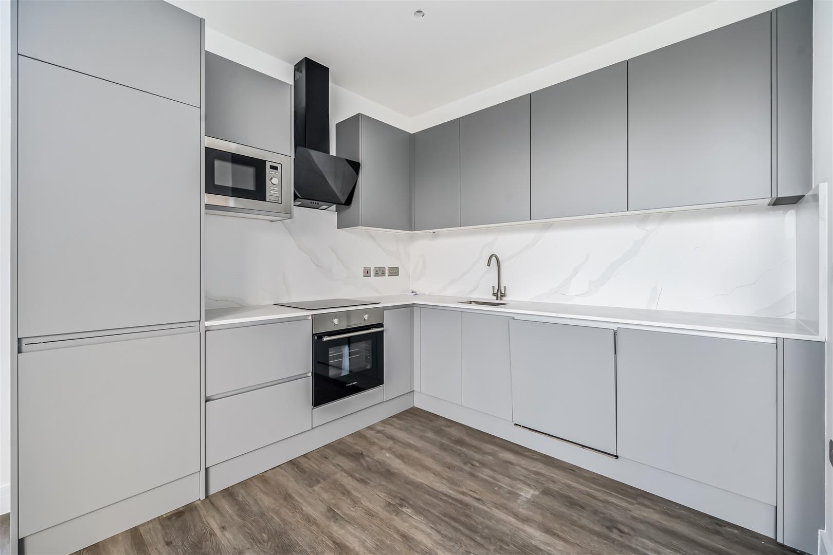 Inside, residents will enjoy beautifully presented interiors featuring laminate flooring and a grey-finish kitchen equipped with integrated Samsung appliances (all with a five-year warranty). The kitchens are completed with quartz worktops, a white marble splashback, an induction hob, integrated microwave, and brushed metallic finishes to the sink and light fittings for a sleek, contemporary look.