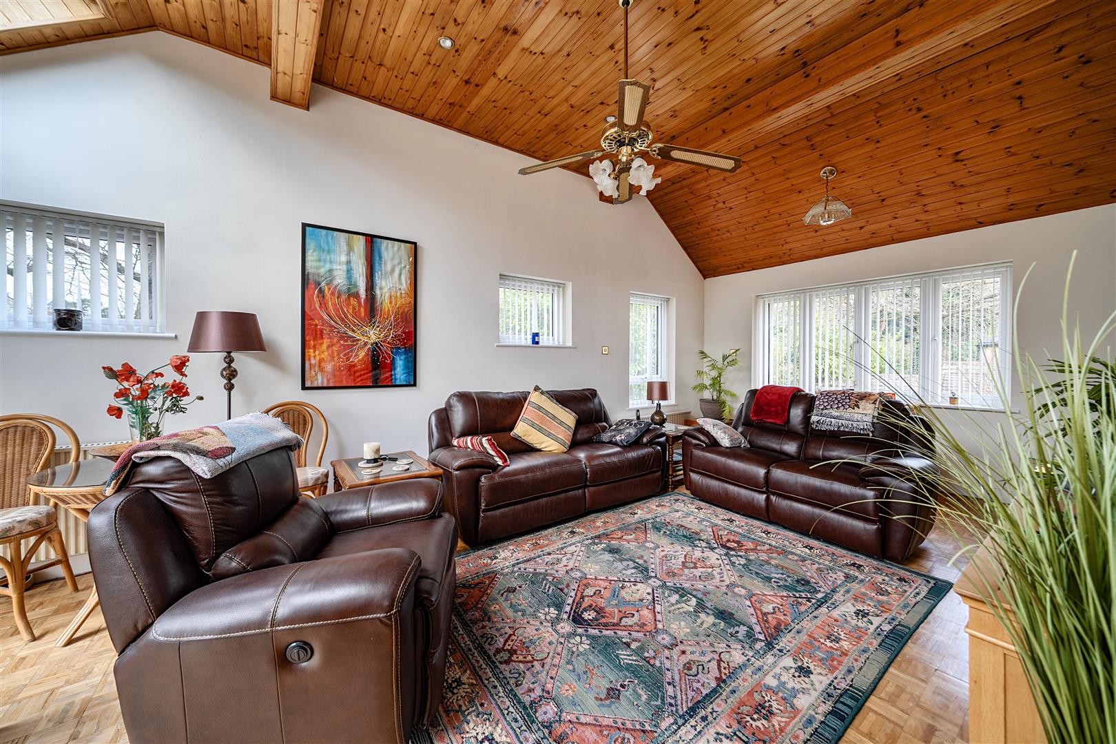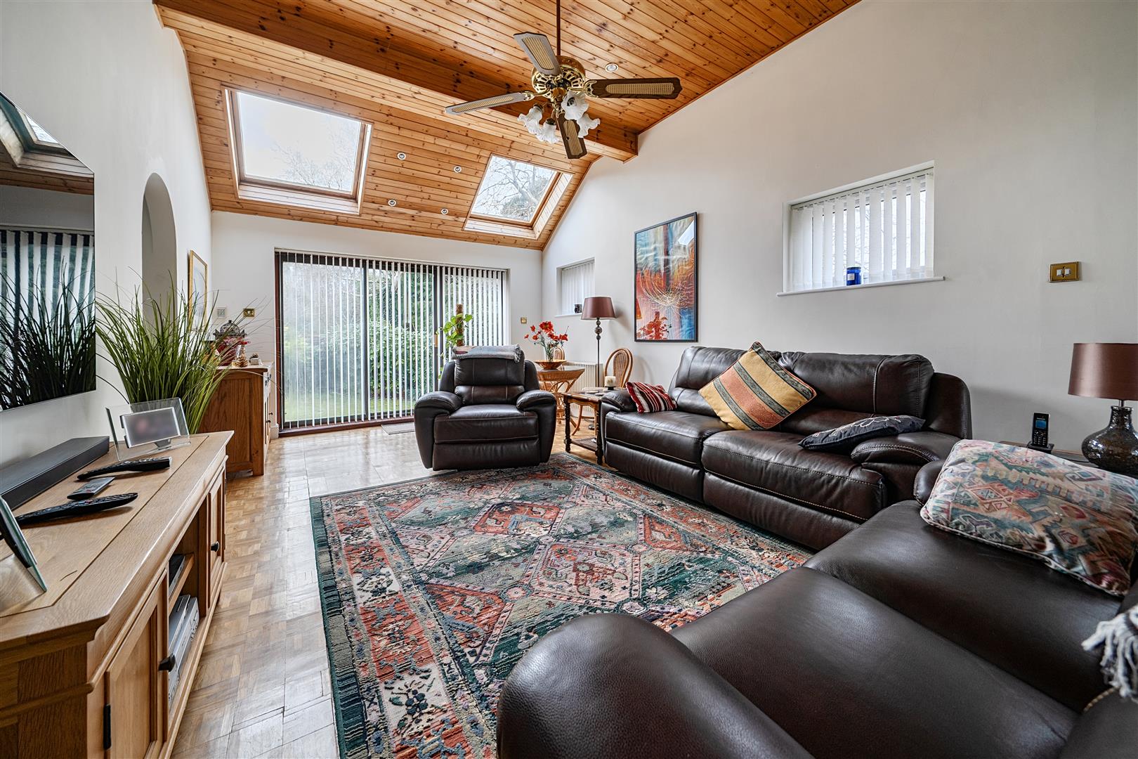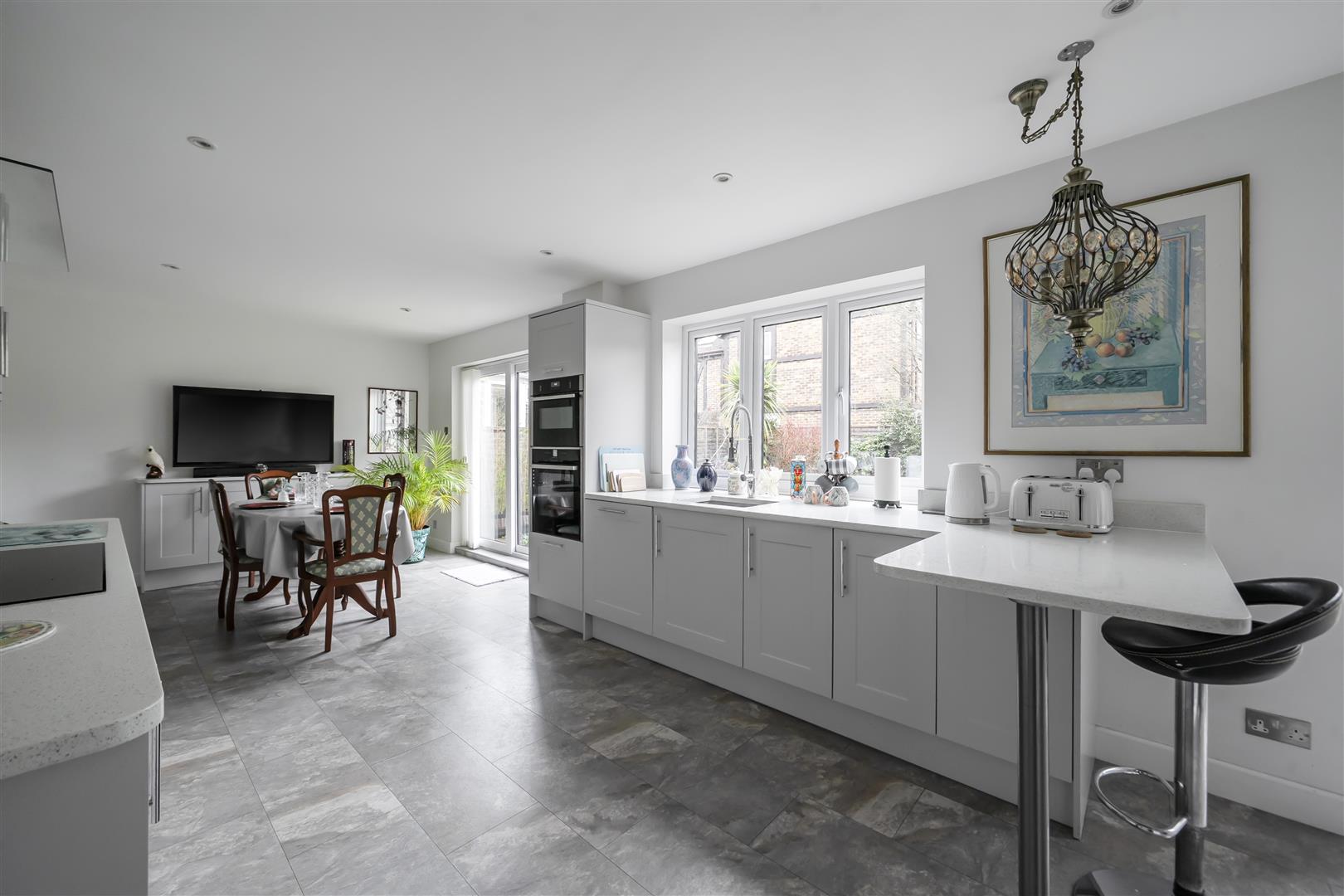 The front door opens to an L-shaped entrance hall with a downstairs bathroom and access is given to the 23ft triple aspect living room, with an impressive vaulted ceiling with velux windows and patio doors open to the garden. The living accommodation is further complemented by a18ft front aspect family room, this room steps through double doors to the impressive 28ft kitchen/dining room, which was redesigned in 2019 with stunning shaker style kitchen complimented with Quartz worktops and a range of integrated appliances. Both the dining and kitchen area give access to the garden and in addition, there is a separate utility room. Upstairs, are four well-proportioned bedrooms, all with fitted wardrobes and bedroom one has a refitted ensuite shower room, all bedrooms are served by a family bathroom.