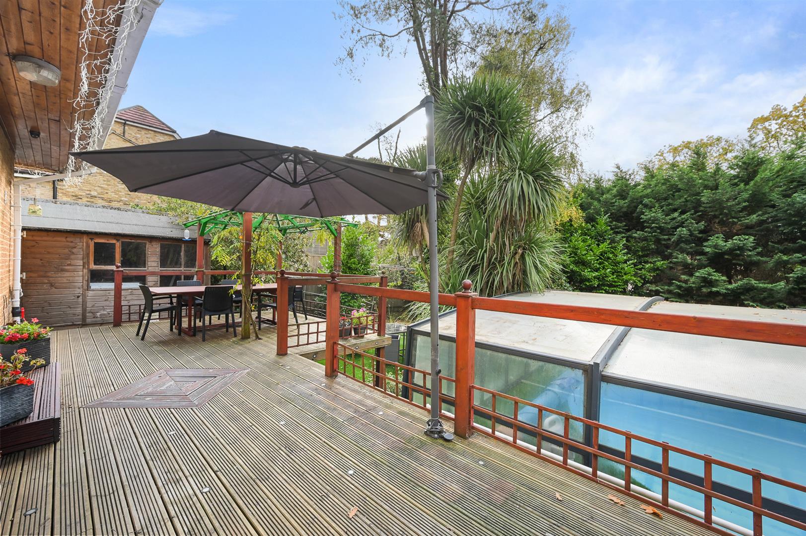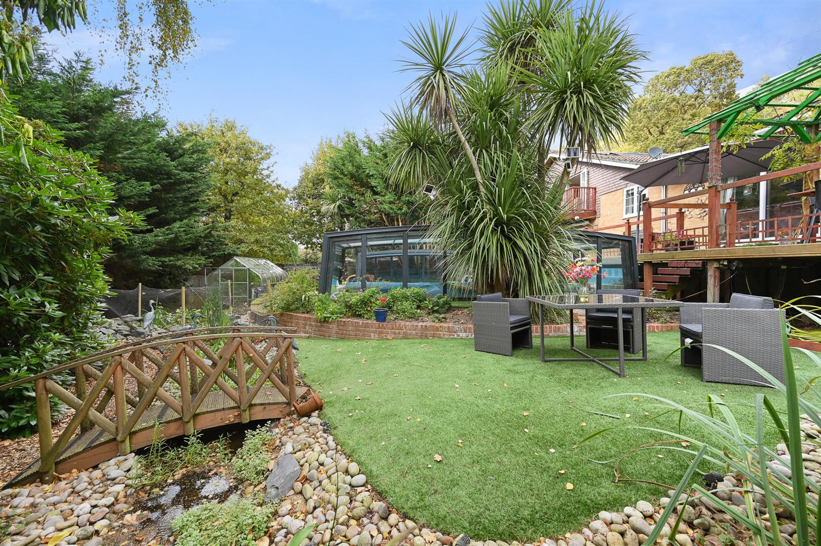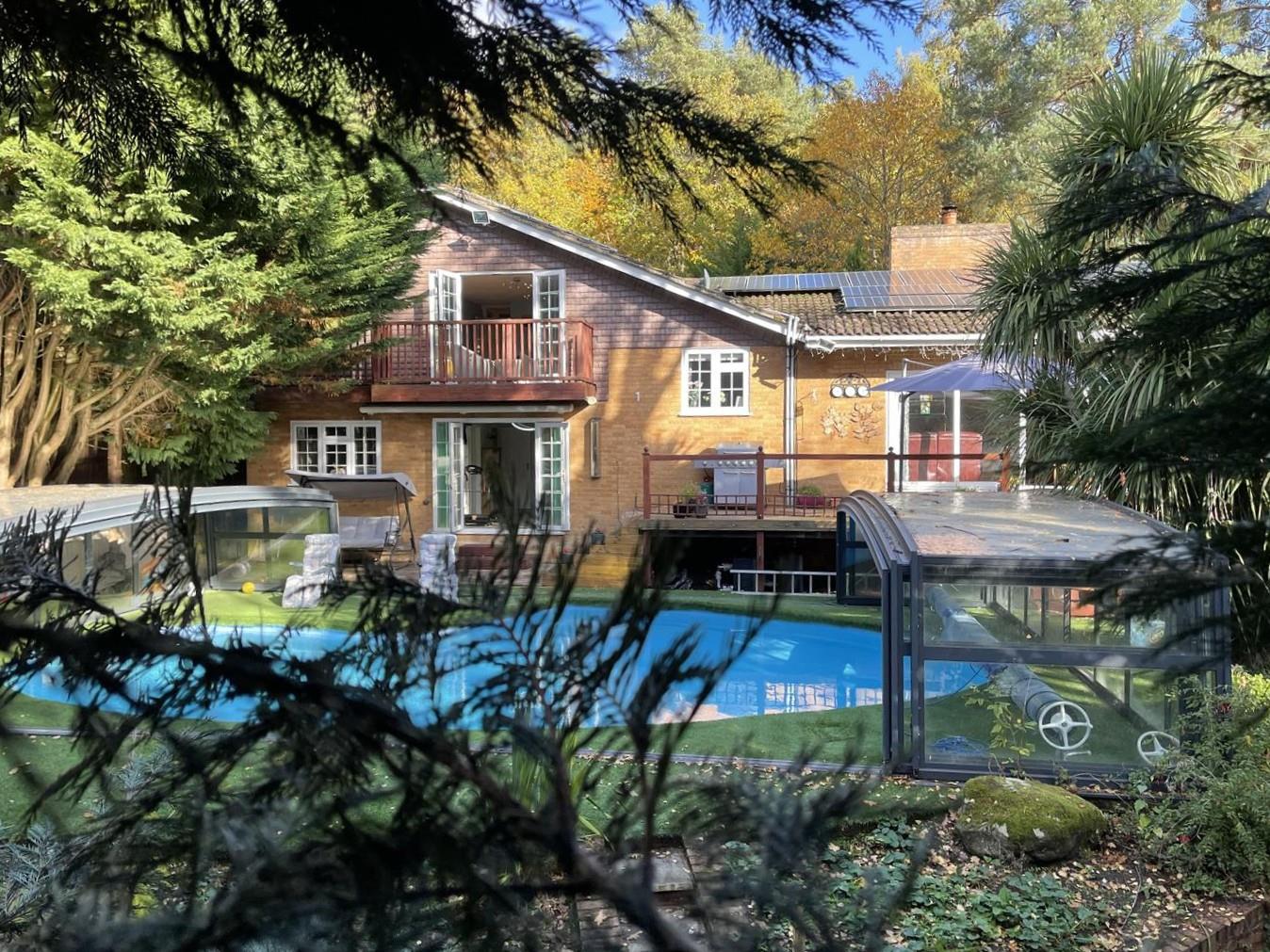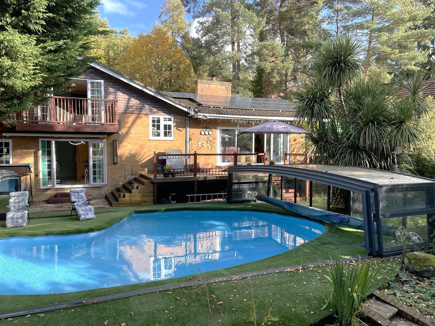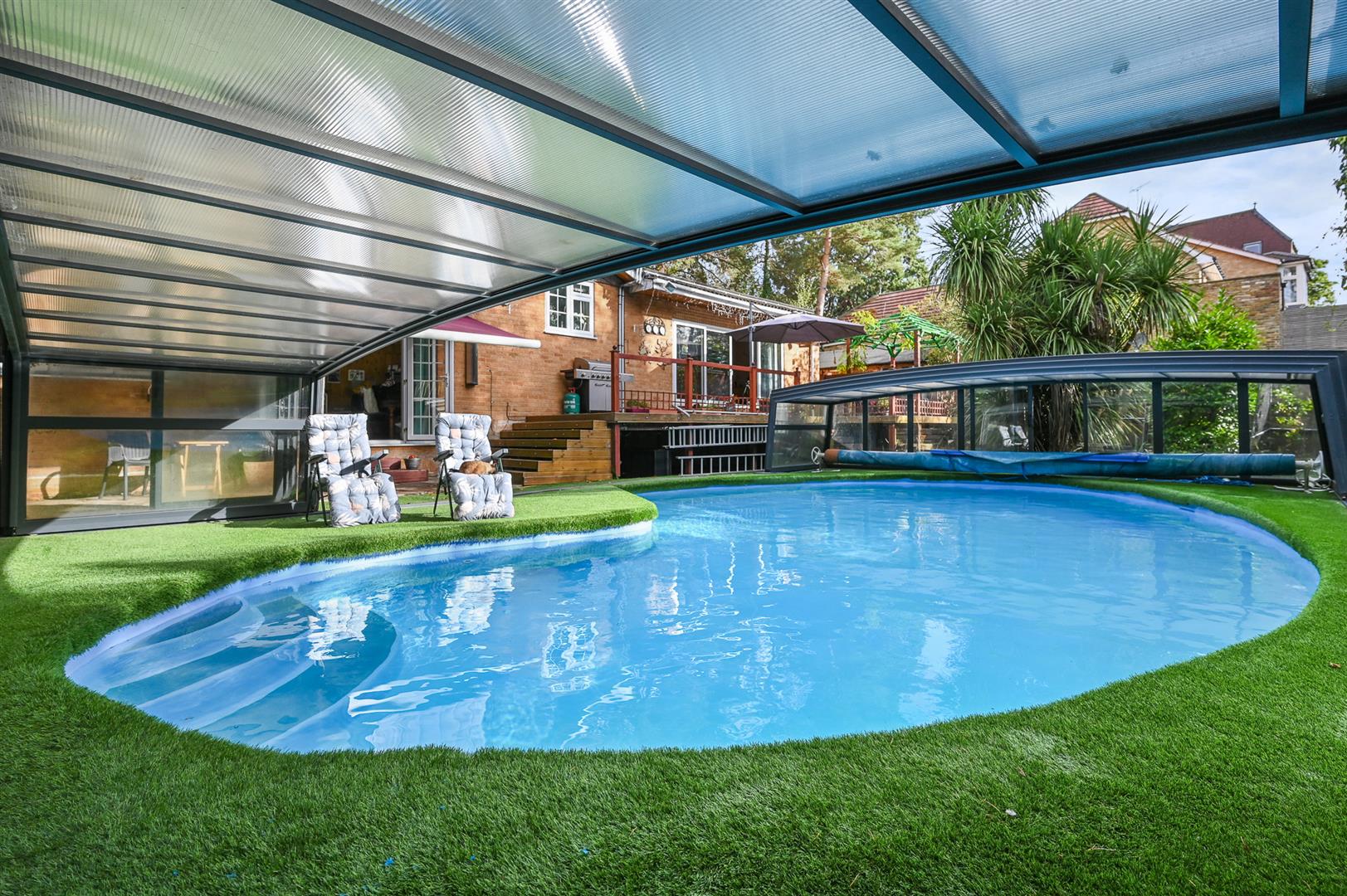The overall plot extends to 0.29 of an acre and is approached by a driveway leading to the garage and bordered by an elevated garden visible from the kitchen and could be re-landscaped to create a formal garden. To the rear is a secluded south facing garden, with ample space for entertaining, as well as a feature garden with and a water feature and stream. The centre piece is the recently refurbished and covered swimming pool with a retractable cover, this allows all year round use. The majority of the garden is low maintenance with artificial lawn.