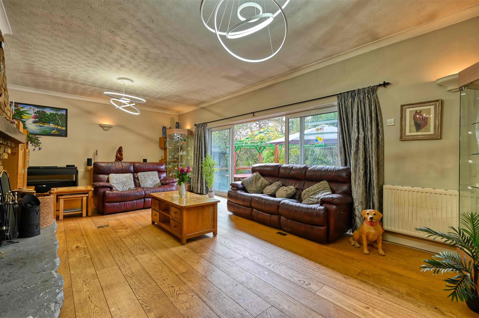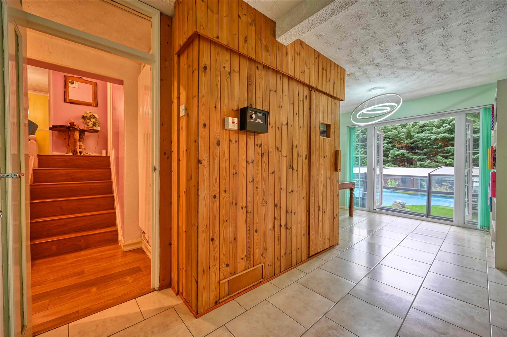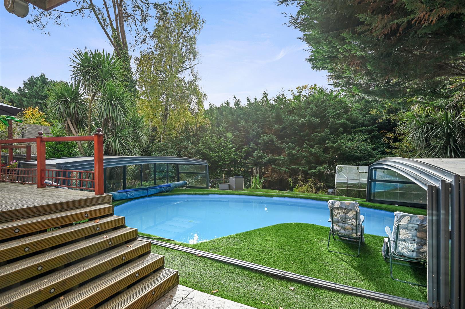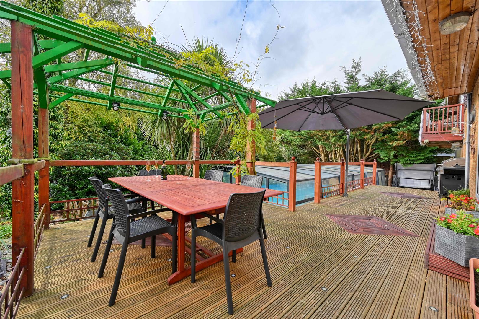 The overall plot extends to 0.29 of an acre and is approached by a driveway leading to the garage and bordered by an elevated garden visible from the kitchen and could be re-landscaped to create a formal garden. To the rear is a secluded south facing garden, with ample space for entertaining, as well as a feature garden with and a water feature and stream. The centre piece is the recently refurbished and covered swimming pool with a retractable cover, this allows all year round use. The majority of the garden is low maintenance with artificial lawn.