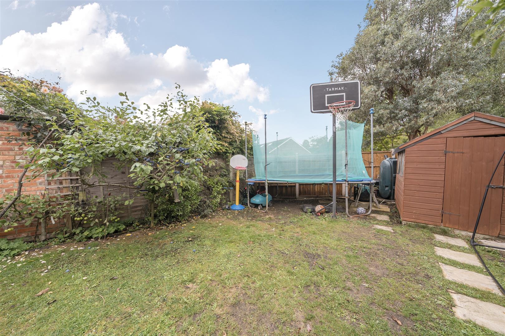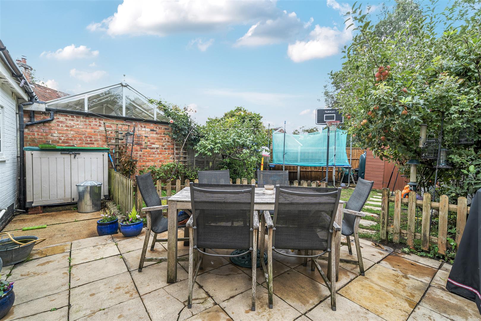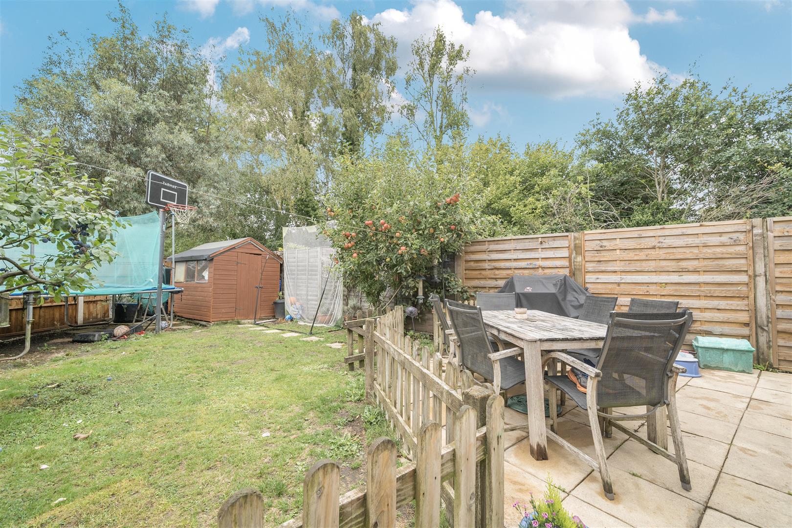 Outside, the rear garden begins with a paved patio leading to a lawned area bordered by shrubs, trees and low-level fencing, all enhanced by side access. To the front, a shingle driveway provides off-road parking, while the property enjoys picturesque views across a conservation area.