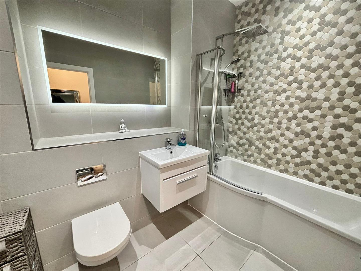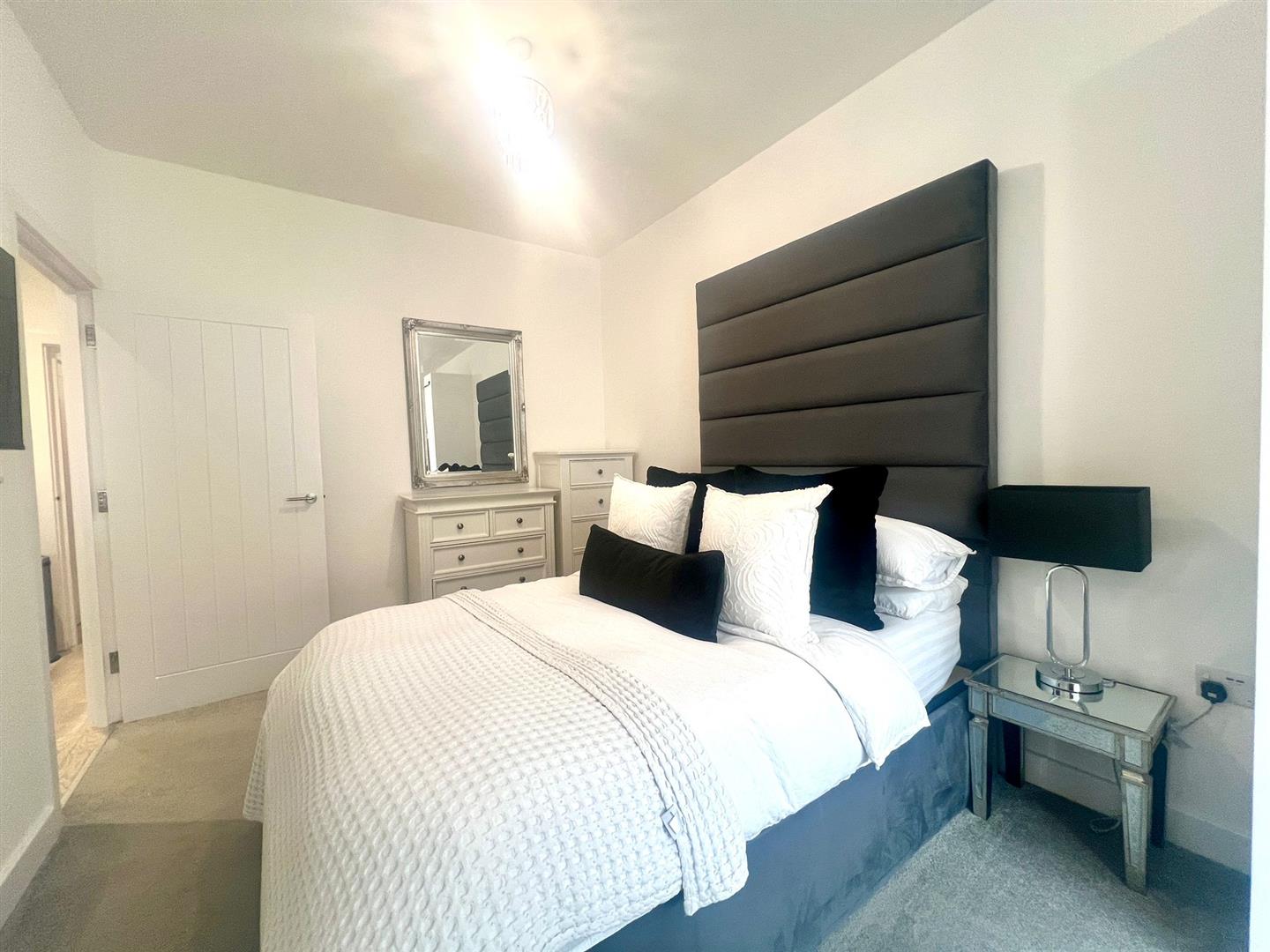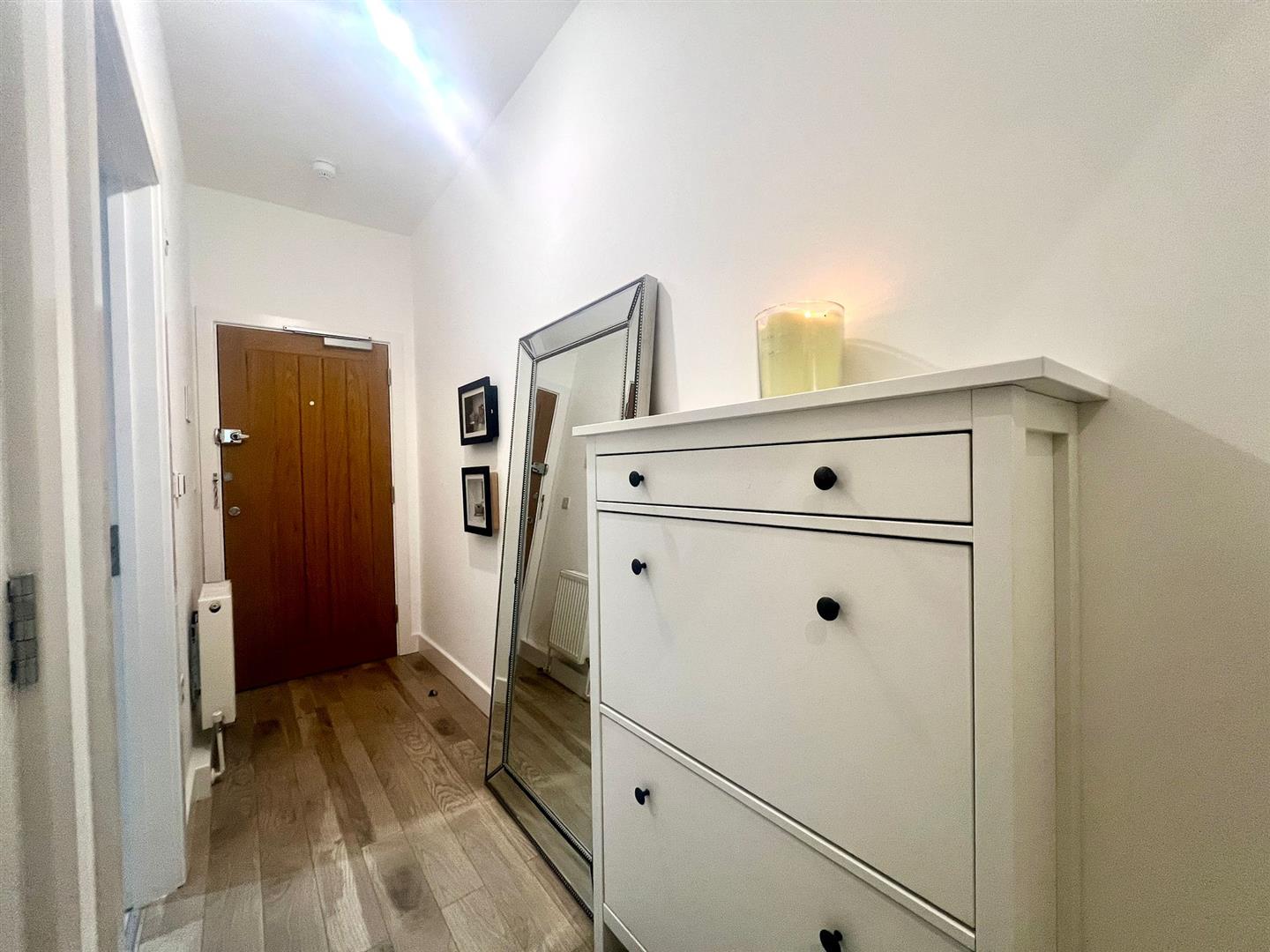 The apartment opens into a central hallway that provides access to all principal rooms. To the front of the property is a bright and generously proportioned open-plan living, dining, and kitchen area measuring approximately 21'10" in length. This versatile space benefits from large windows that allow for excellent natural light and a sense of openness. The contemporary kitchen is fitted with modern cabinetry, ample worktop space, and integrated cooking appliances, making it ideal for everyday living and entertaining. The double bedroom is located to the rear of the apartment and offers an impressive amount of space, comfortably accommodating a king-size bed along with wardrobes and additional furniture. Its layout also lends itself well to creating a home office area if desired, making it perfect for those working remotely. A modern, fully fitted bathroom with underfloor heating serves the property, comprising a full-sized bath with shower over, a WC, and a wash basin, all finished in neutral tones. In addition, there is a useful internal storage room located off the hallway, offering convenient space for household essentials creating a great utility space.