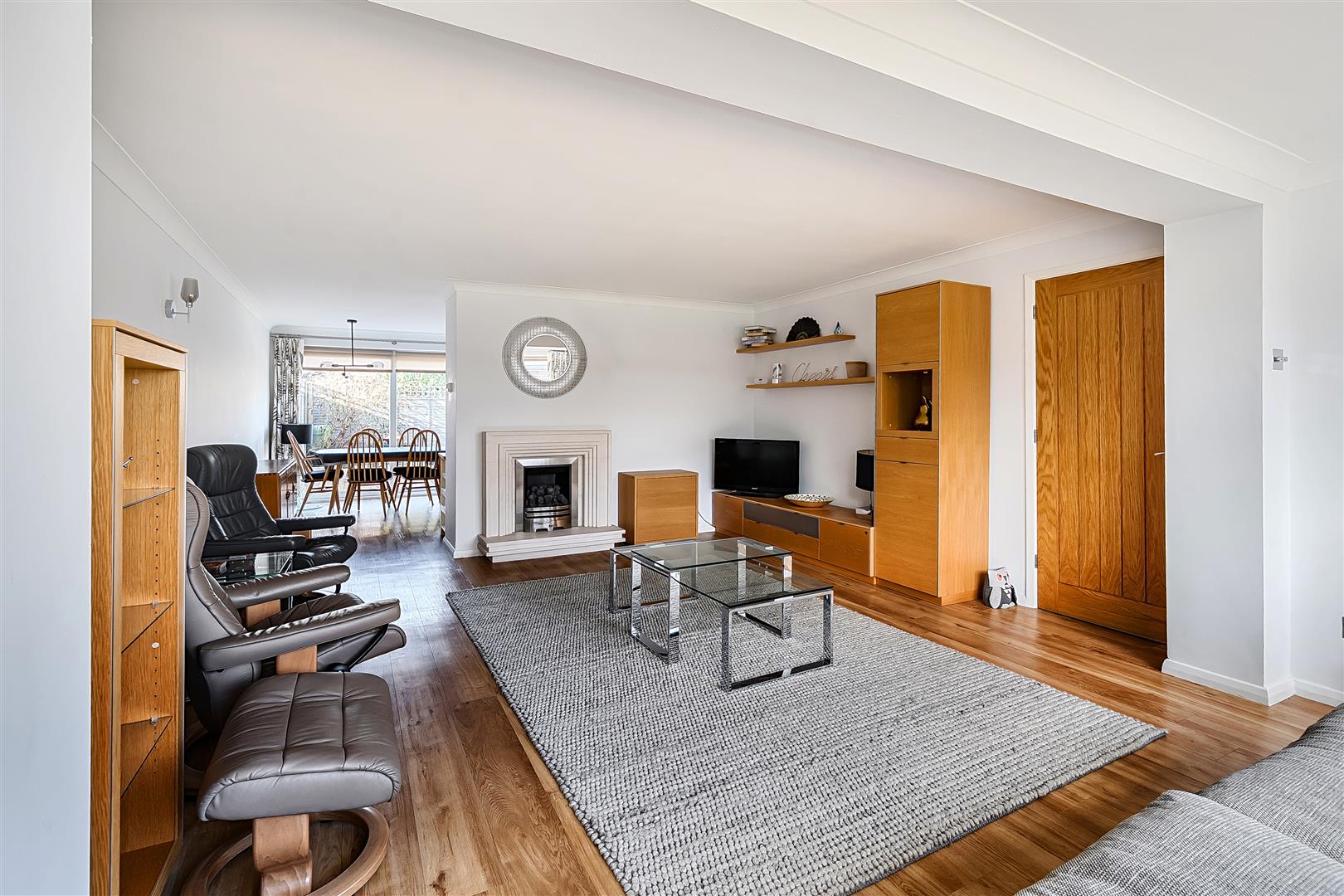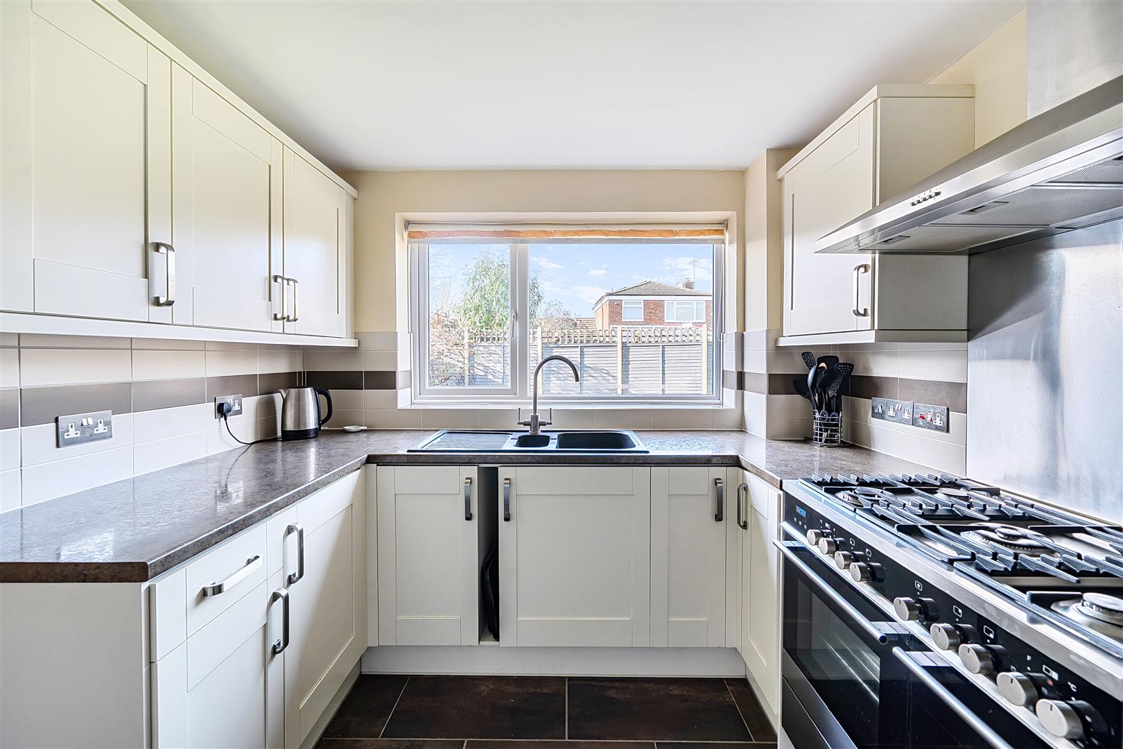 The accommodation comprises an entrance hallway with a downstairs cloakroom, a spacious 19ft by 14ft living room featuring a fireplace and opening into a dining area, and a refitted kitchen complete with a range cooker. The kitchen leads through to an impressive 30ft garage with patio doors opening onto the rear garden. Upstairs, the property offers three bedrooms, two of which are generous doubles, together with a modern shower room benefitting from extensive fitted storage.