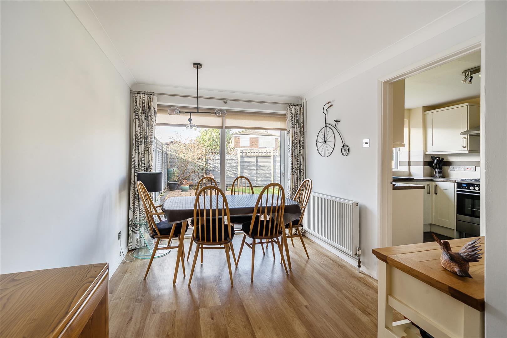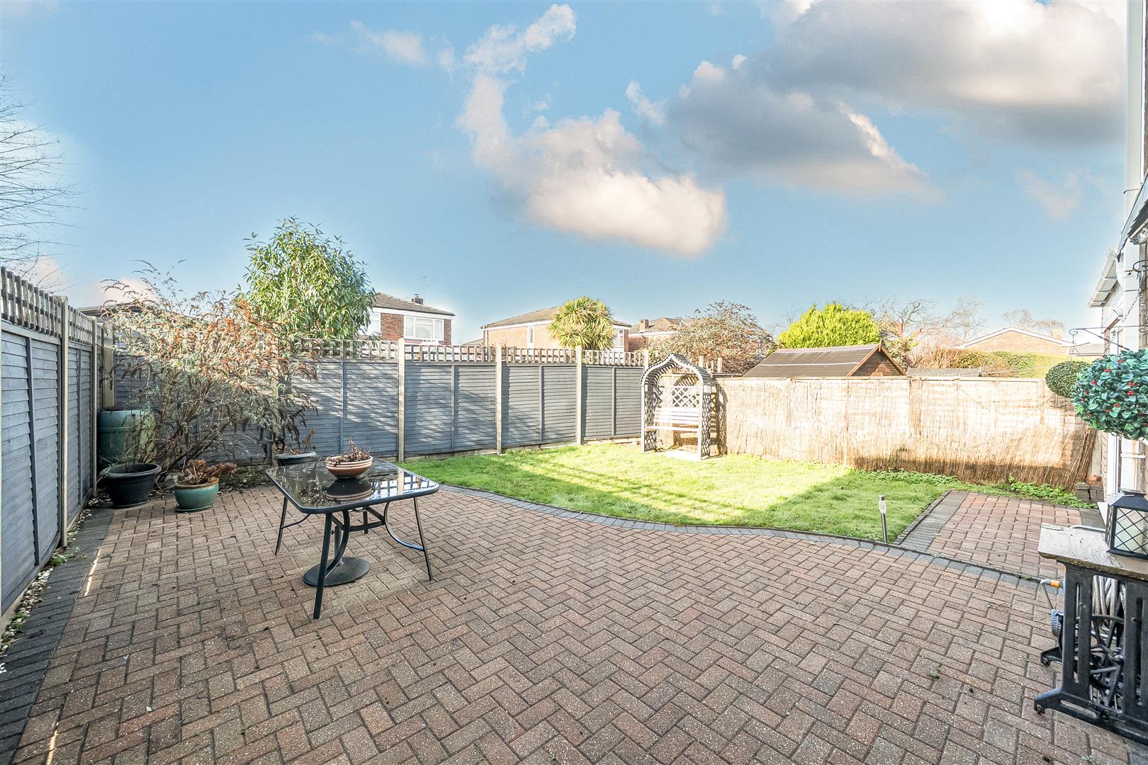 To the front, ample driveway parking for multiple vehicles leads to the garage with an electric roller door. The rear garden is primarily laid to a large patio, complemented by a lawned area, with patio doors providing access from both the dining area and the garage.